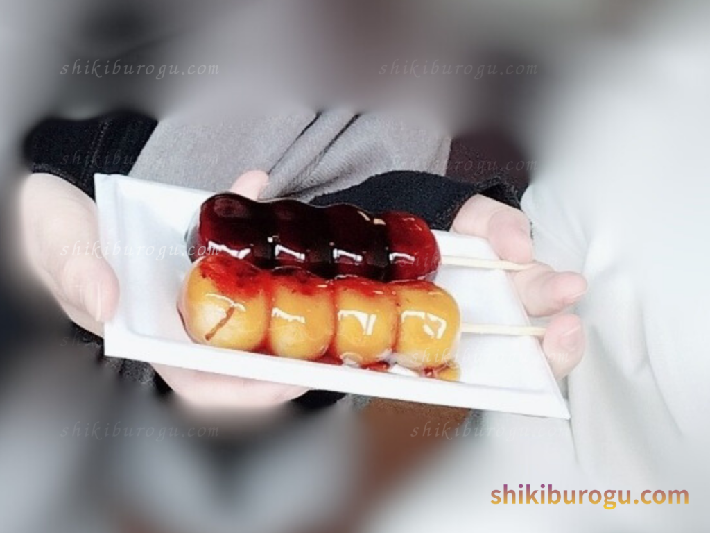 黒い方が、黒糖みつだんご(250円)と薄茶がみたらし団子(200円)