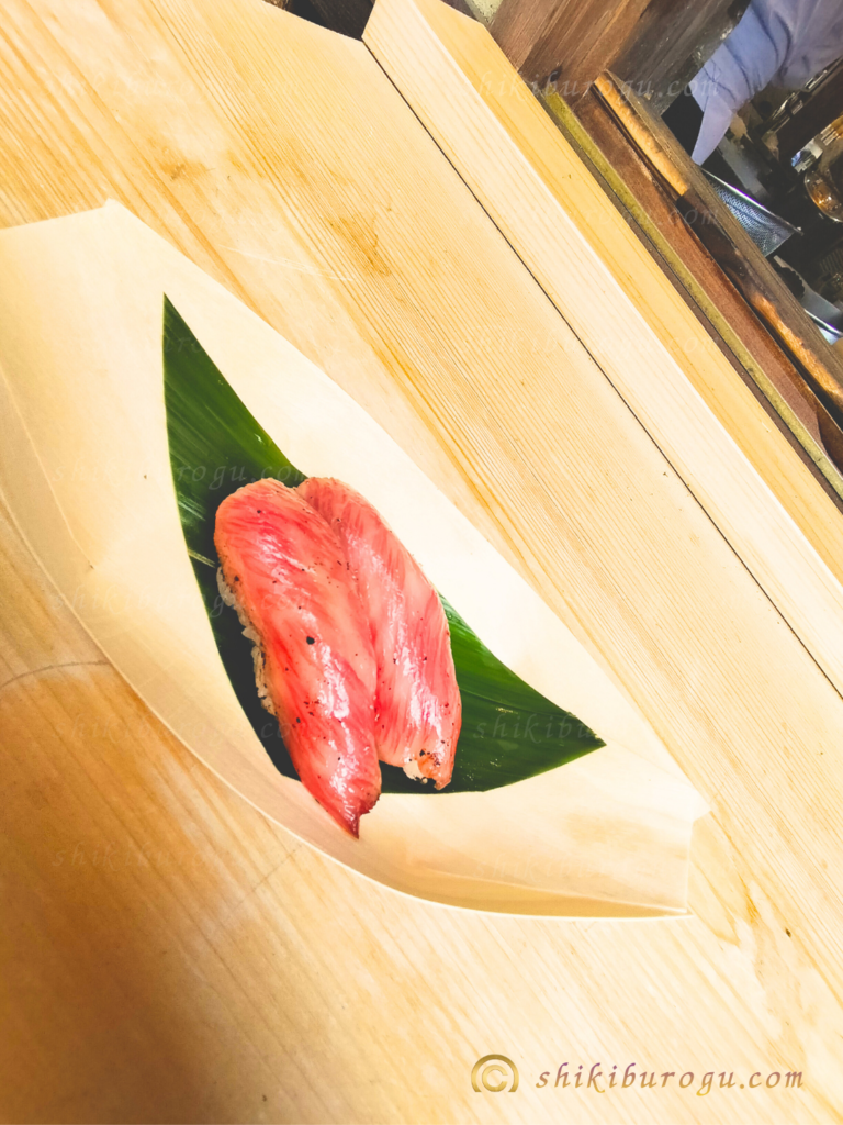 炙られて牛肉のいい香りが漂う肉寿司。めっちゃおいしかった!